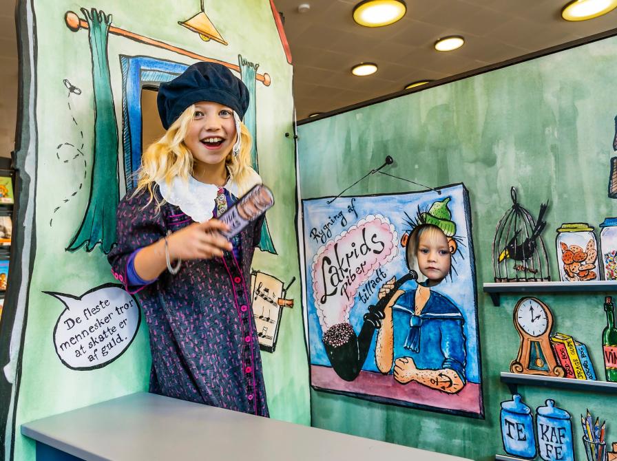 I kan også lave dukketeater, besøge købmanden eller være den store smed for en dag. Der er købmandsvarer i træ, kæmpestore lakridspiber, sjove kostumer og så er væggene fulde af citater fra historien Lille Virgil.